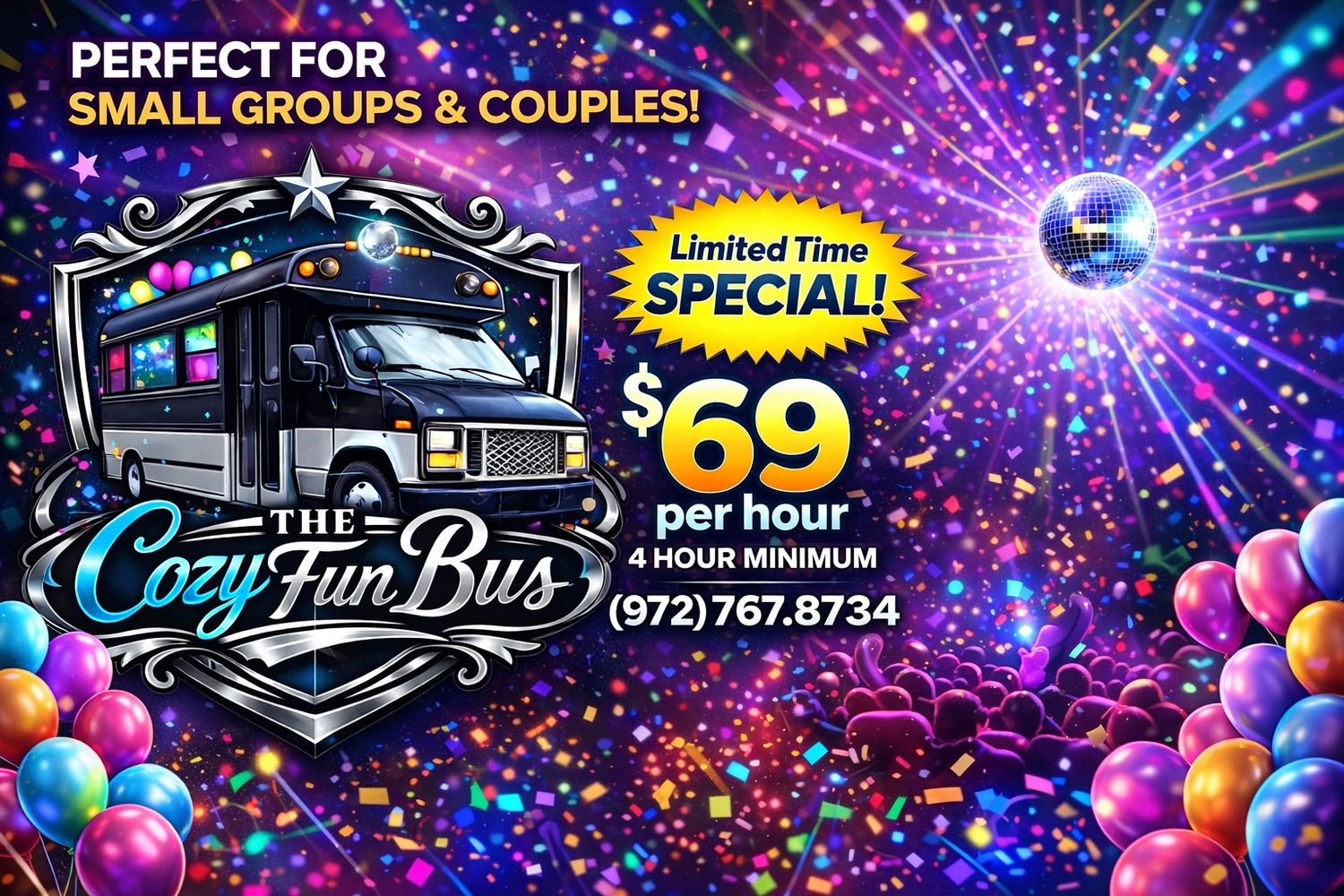 Limo Bus - Grab your group and hop onboard for a quick ride to your destination. Mix and Mingle while you ride with your favorite friends. Arrive to your destination in style. Take advantage of this Special Offer while it last CashApp to $cozyfunbus or call: (972)767-8734 and pay by card